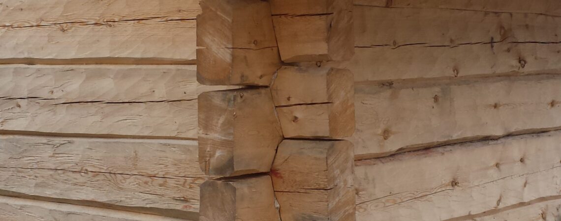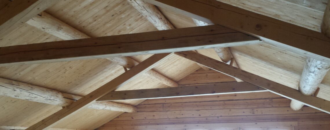 Båthuset består av ett rum med måtten 9×6 meter. Takåsarna behövde därför kompletteras med stödjande taksaxar som syns på interiörbilden. 5" timmer. Handbilad utsida/insida Knuttyp: Halsad Enkelkattsknut Mått: 9 x 6 meter Projektår 2015