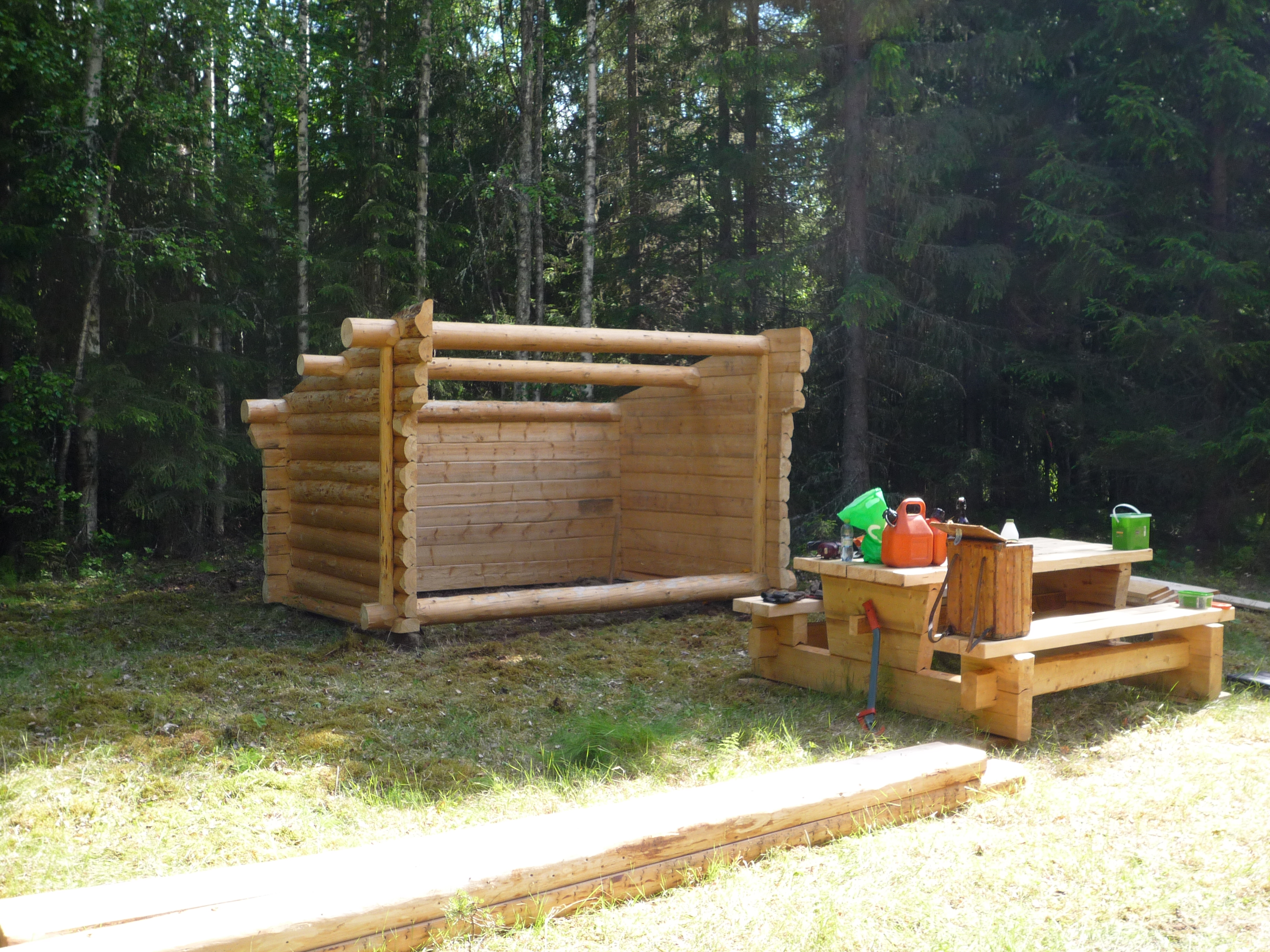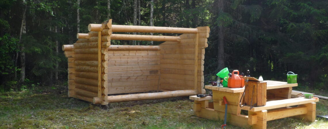 Vindskyddet som idag står i ett naturreservat utmed Vindelälven i Vännäs kommun är timrat av halva rundstockar med tak av brädor på lock.